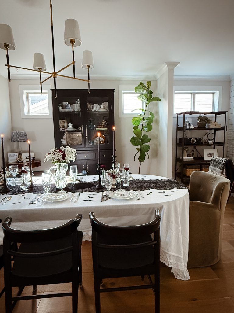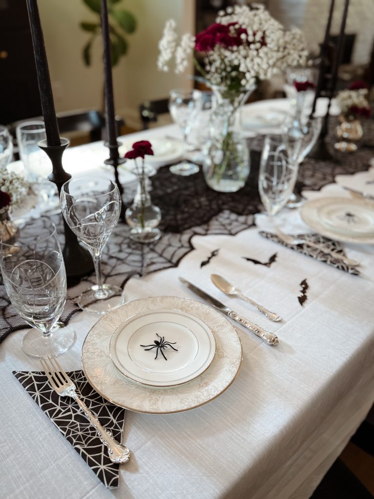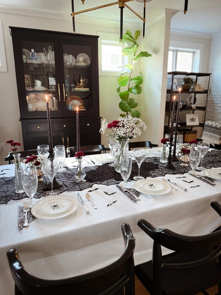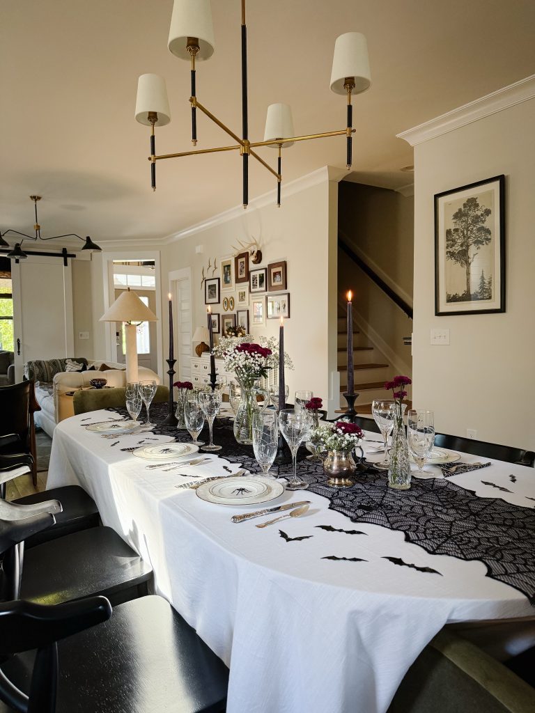 Typically, I don’t decorate much for Halloween. I have a few cute ghosts that I put out and recently added ghost garland, but for the most part … I decorate for fall and skip the Halloweenie decor. This year, however, I hosted a Witches Night In dinner party and I wanted create a table that was less cobwebs and more candlelight — a chic, gothic-glam-inspired table.
