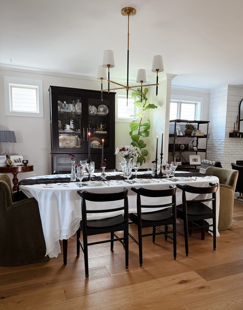 I love creating tablescapes — it’s one of my favorite ways to celebrate each holiday. Our floor plan is very open… maybe a little too open (imo). The dining room sits right in the heart of the first floor, wide open to both the living room and kitchen. A year or two ago, my husband built us a stunning walnut table, and I love finding ways to dress it up. It’s the perfect spot to celebrate the season and bring a little extra magic to our home.