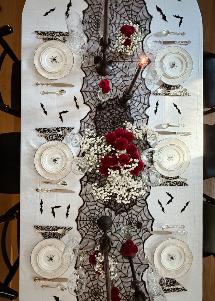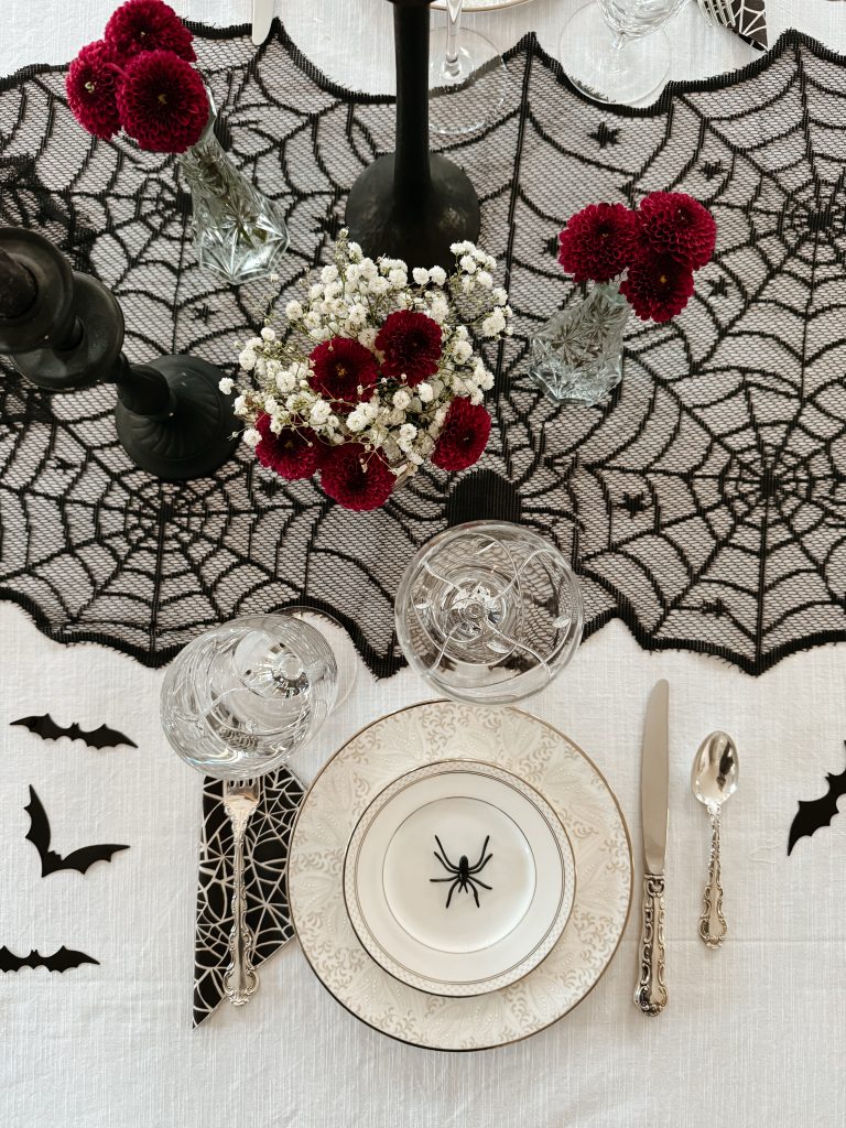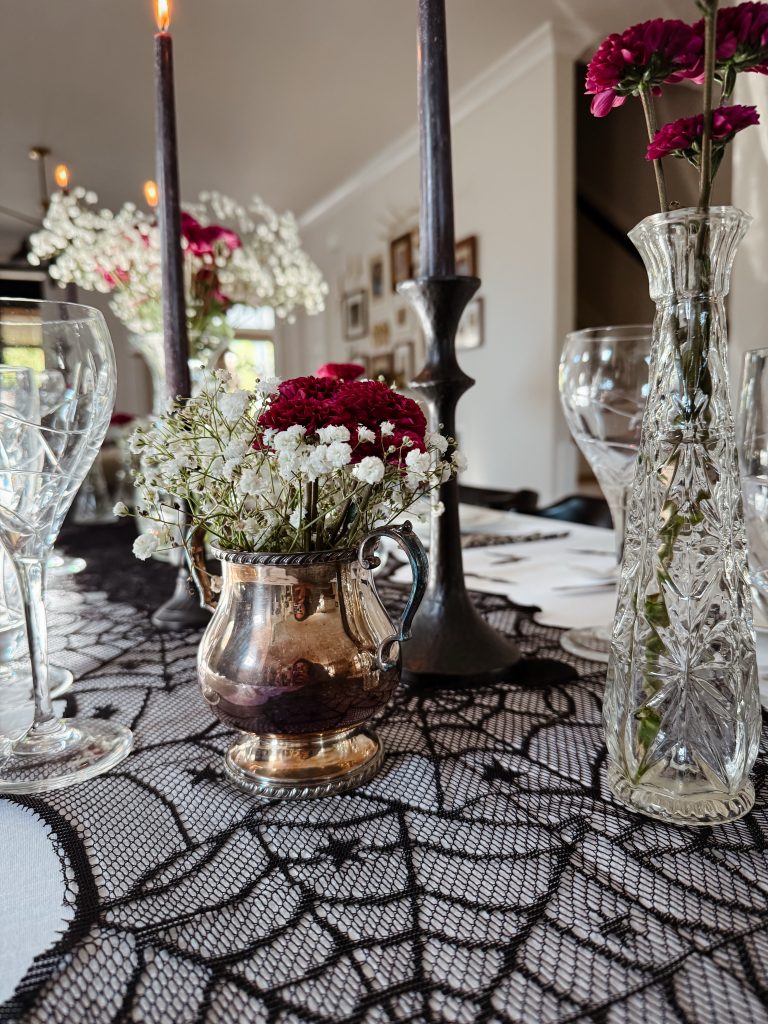 A chic twist on Halloween styling — it’s equal parts goth and glam. This year’s Halloween table is all about the details — soft candlelight, moody florals, and a subtle hint of gothic romance.
