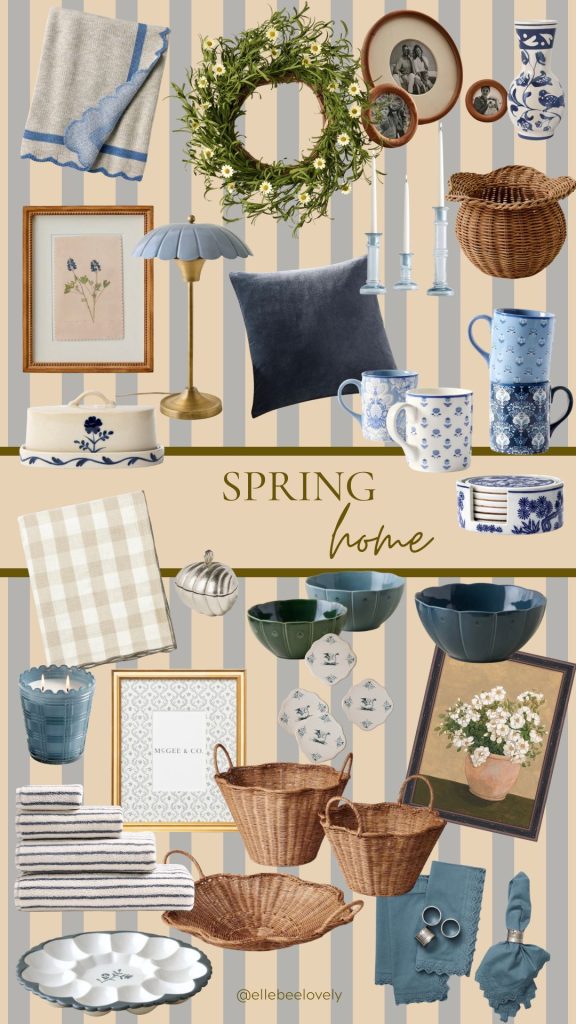 Links: Throw Blanket, Daisy Wreath, Round Tabletop Frames, Bud Vase, Table Lamp, Velvet Pillow, Blue Glass Taper Candle Holder, Woven Vase, Butter Dish, Garden Mugs, Coasters, Check Tablecloth, Shell Container, Mixing Bowl Set, Candle, Frame with Patterned Mat, Swan Coasters, Potted Rose Artwork, Blue Stripe Towels, Scallop Woven Bowl, Scallop Large or Small Basket, Deviled Egg Tray, Napkins, Napkin Rings or shop the full board on LTK!